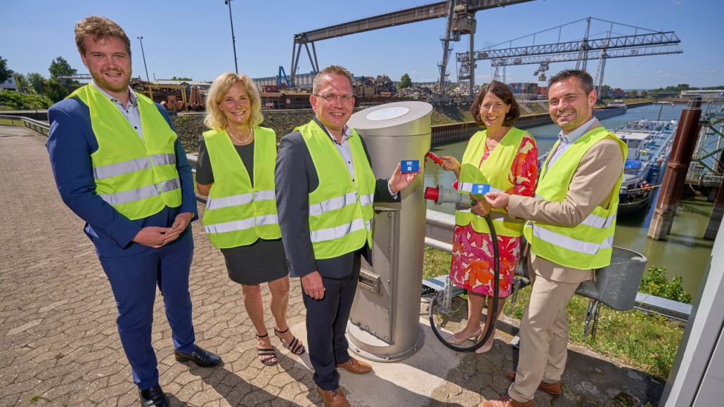 Foto: Wirtschafts- und Verkehrsministerin Daniela Schmitt (2. von rechts) bei der Inbetriebnahme der Landstromanlagen im Rheinhafen in Koblenz.